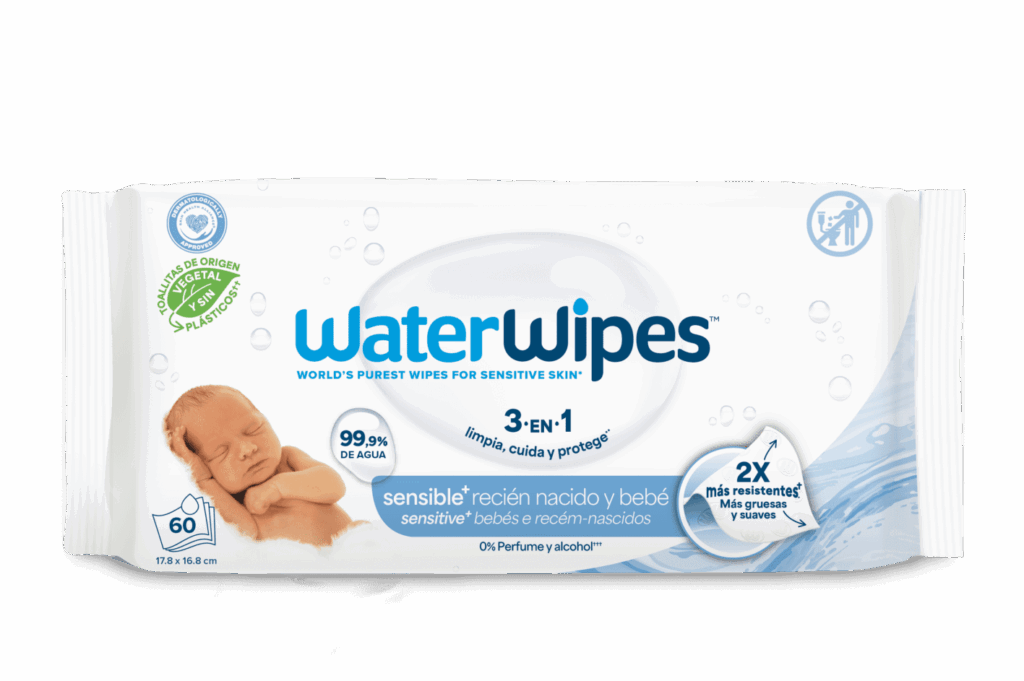 Las toallitas WaterWipes son conocidas por estar formuladas con solo dos ingredientes —99,9 % agua purificada y una gota de extracto natural de semilla de pomelo—, lo que las convierte en una de las opciones más suaves y respetuosas con la piel sensible de bebés, incluso recién nacidos y prematuros.